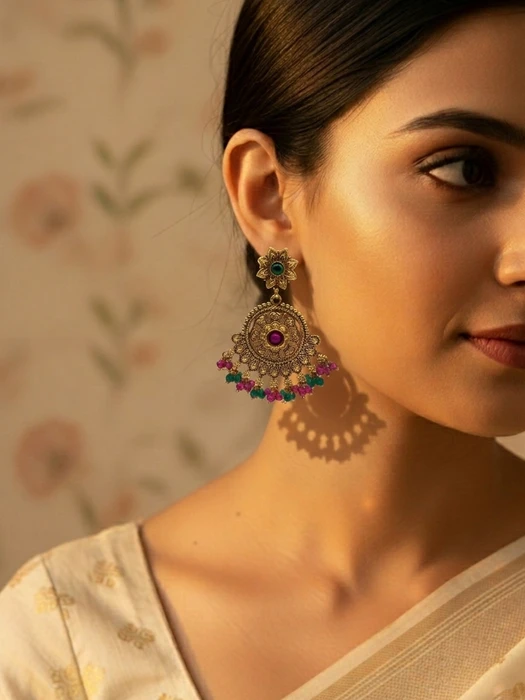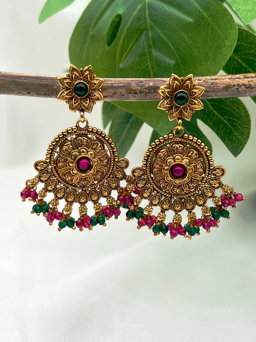 The rich antique gold-tone finish exudes warm luxury, making these lightweight earrings the perfect companion for sarees, lehengas, bridal outfits, anarkalis, or festive attire. Ideal for weddings, Diwali, Navratri, or celebrations where you want to radiate bold, colorful sophistication and feminine grace.