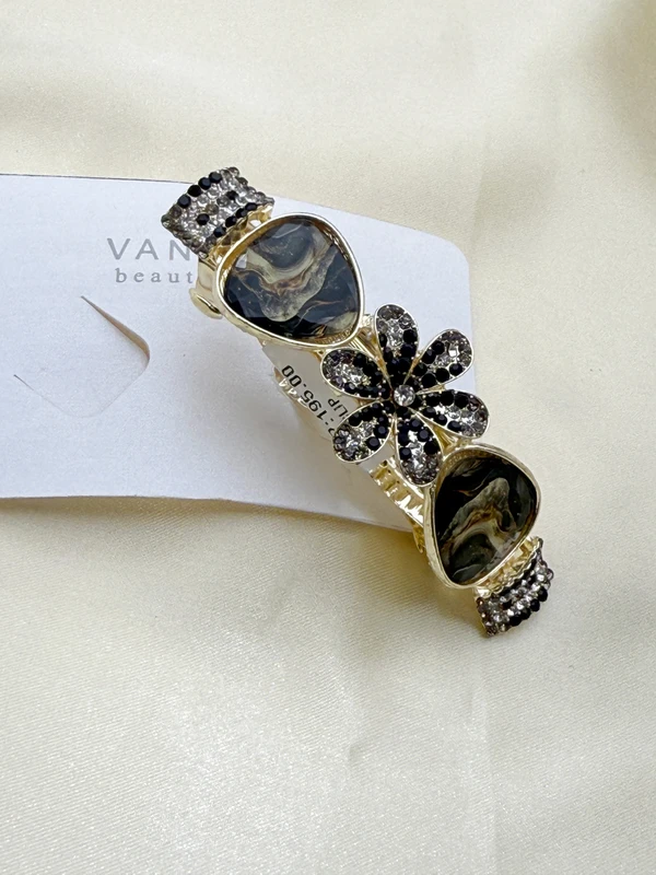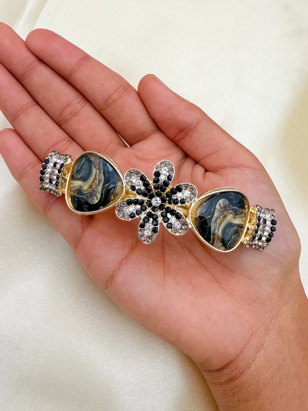Onyx Bloom Gold Clip. A striking gold-tone hair barrette featuring a crystal AD stone flower and two unique, marbled abstract stones. A bold black and gold hair accessory for a modern, sophisticated look.