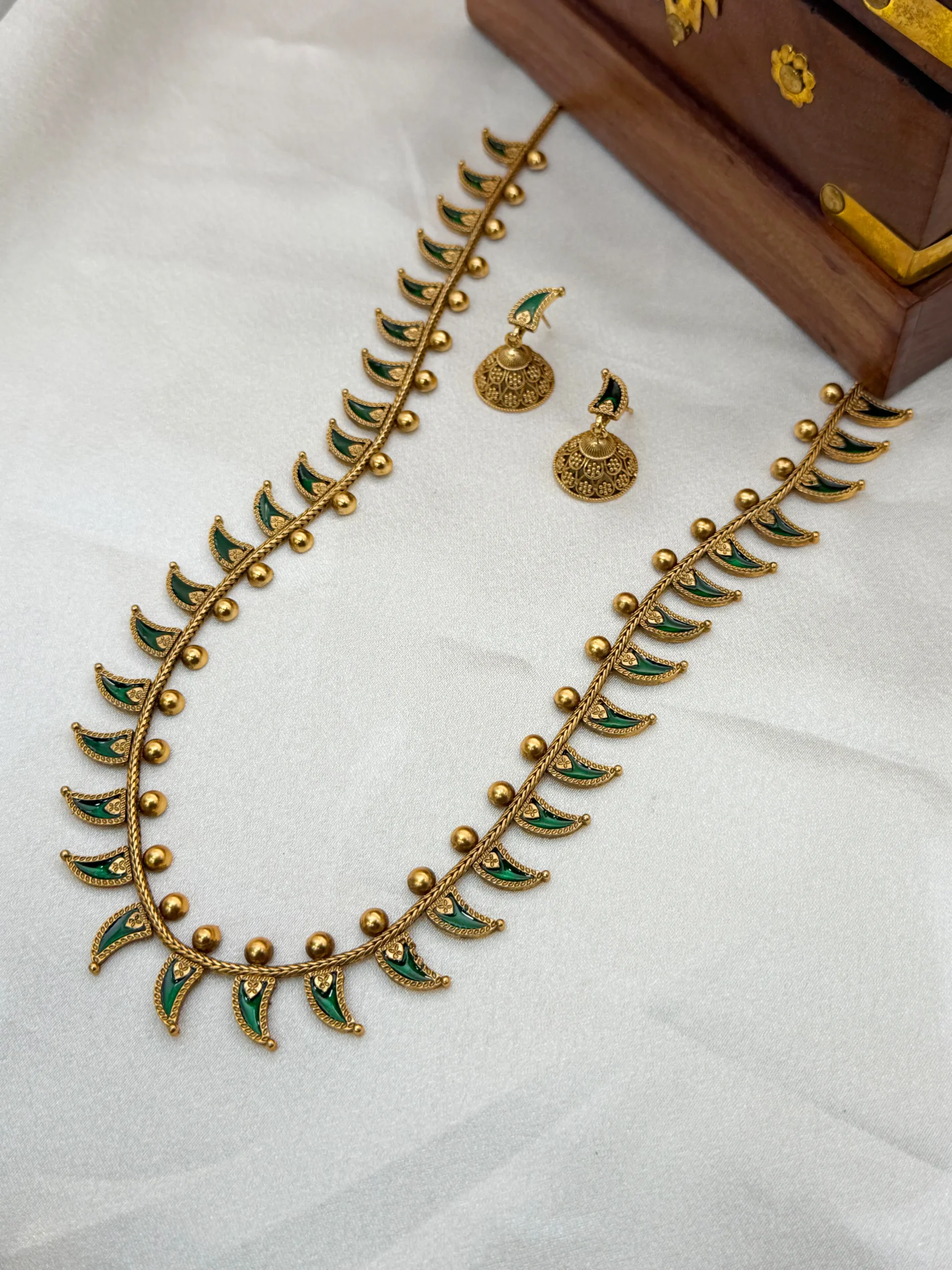 The iconic Palakka Leaf Haram Set. This traditional Kerala necklace features a seamless link of continuous green leaf (Palakka) motifs in a rich, antique gold finish. The ultimate South Indian wedding jewelry set. This Mala (Haram) is traditionally a key piece in a Kerala bride’s ensemble, perfect for layering with a Kasu Mala or wearing on its own for temple visits and major festivals.