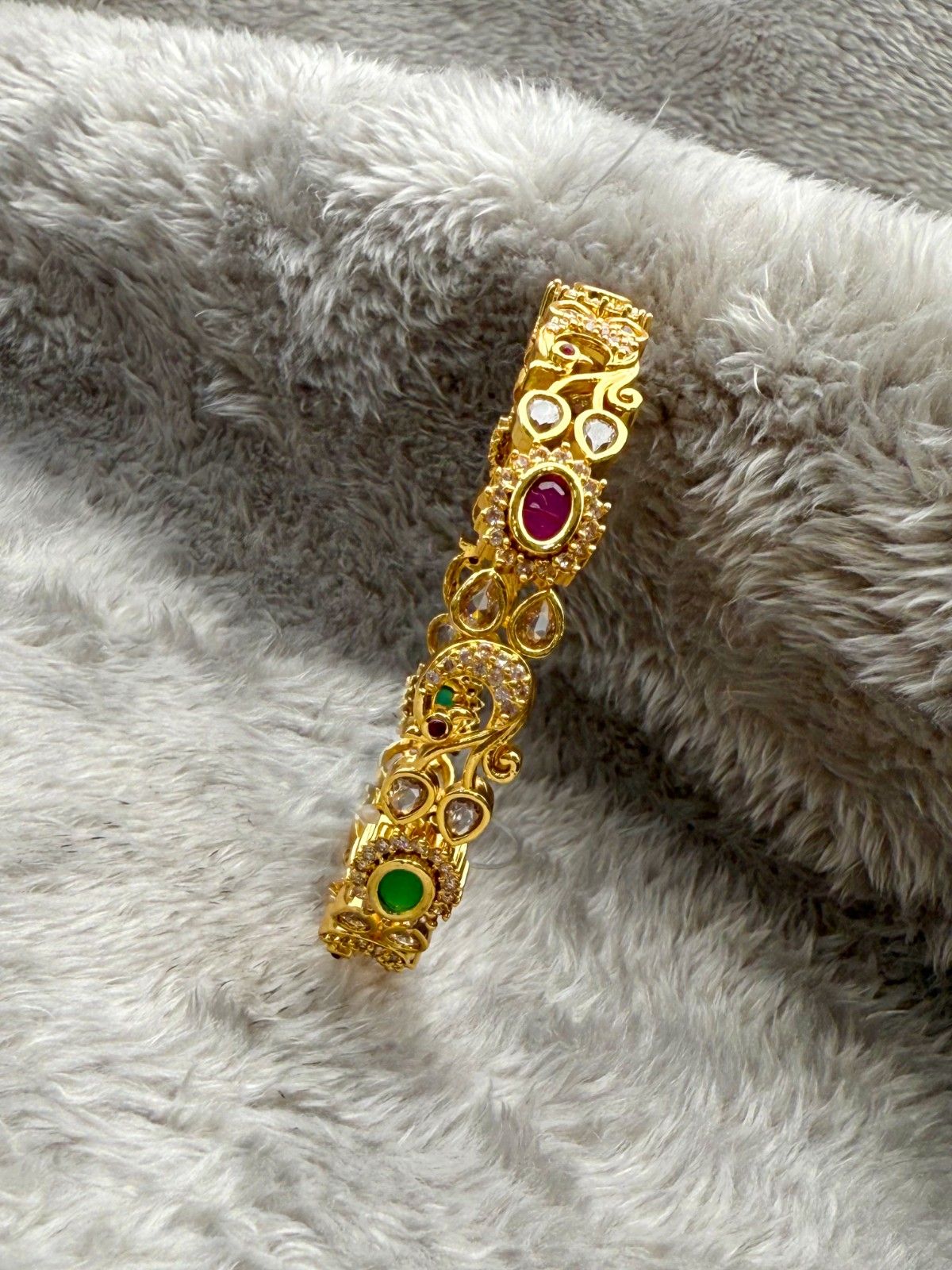 Embrace the vibrant allure of the Peacock Scroll Multi-Stone Bangle, a magnificent piece that perfectly captures the spirit of South Indian heritage jewelry. Crafted with a rich, durable antique gold-tone finish, this bangle is a true artistic statement.