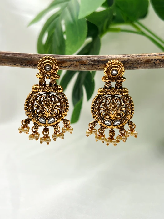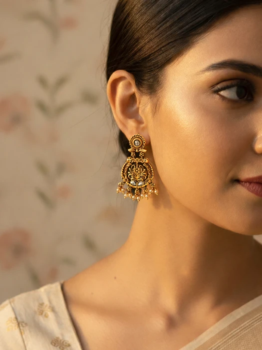 The rich gold-tone finish exudes luxurious heritage appeal, making these lightweight earrings the perfect finishing touch for sarees, lehengas, bridal looks, anarkalis, or festive attire. Ideal for weddings, Diwali, Navratri, or any celebration where you want to radiate refined sophistication and feminine grace.