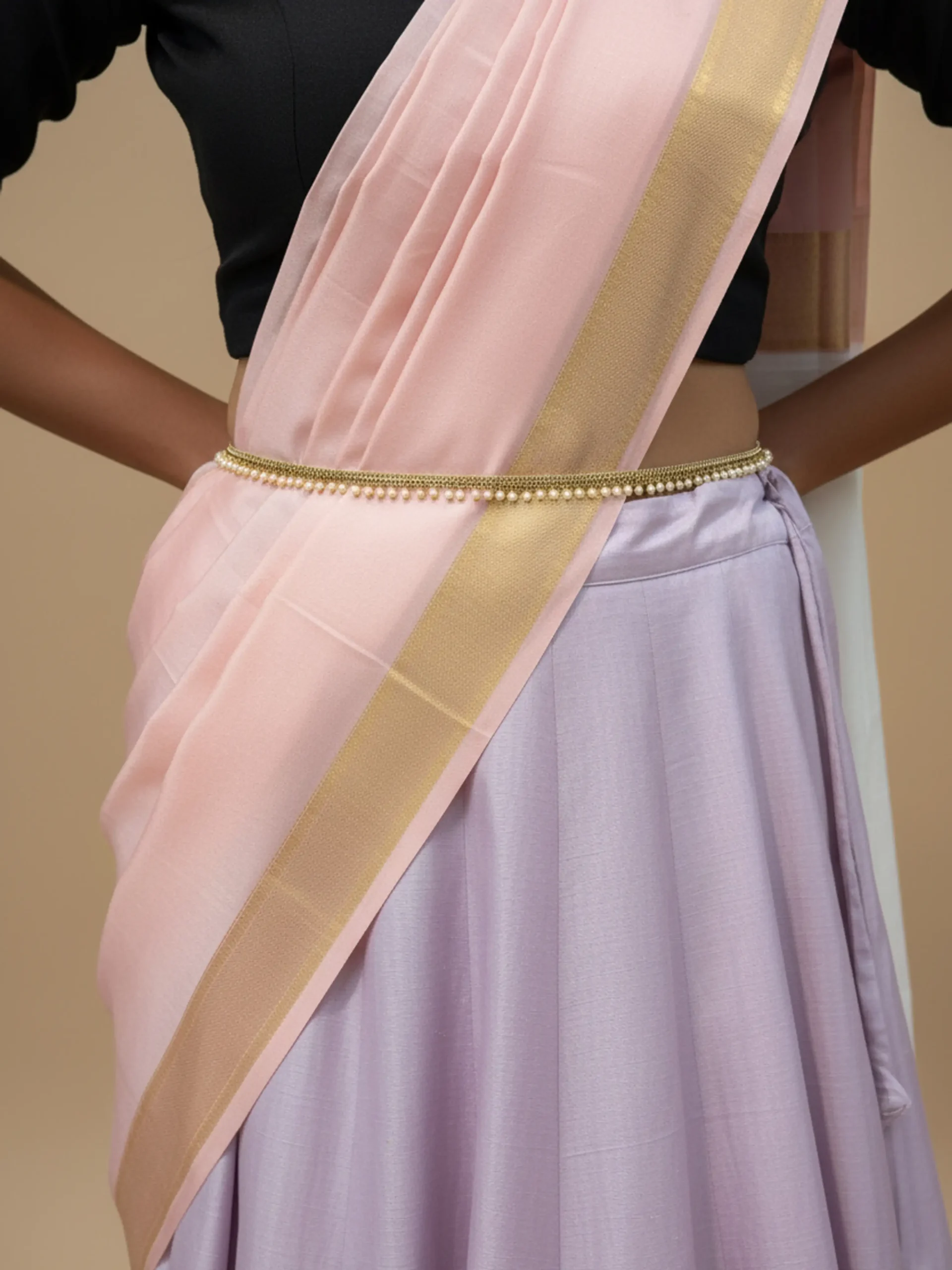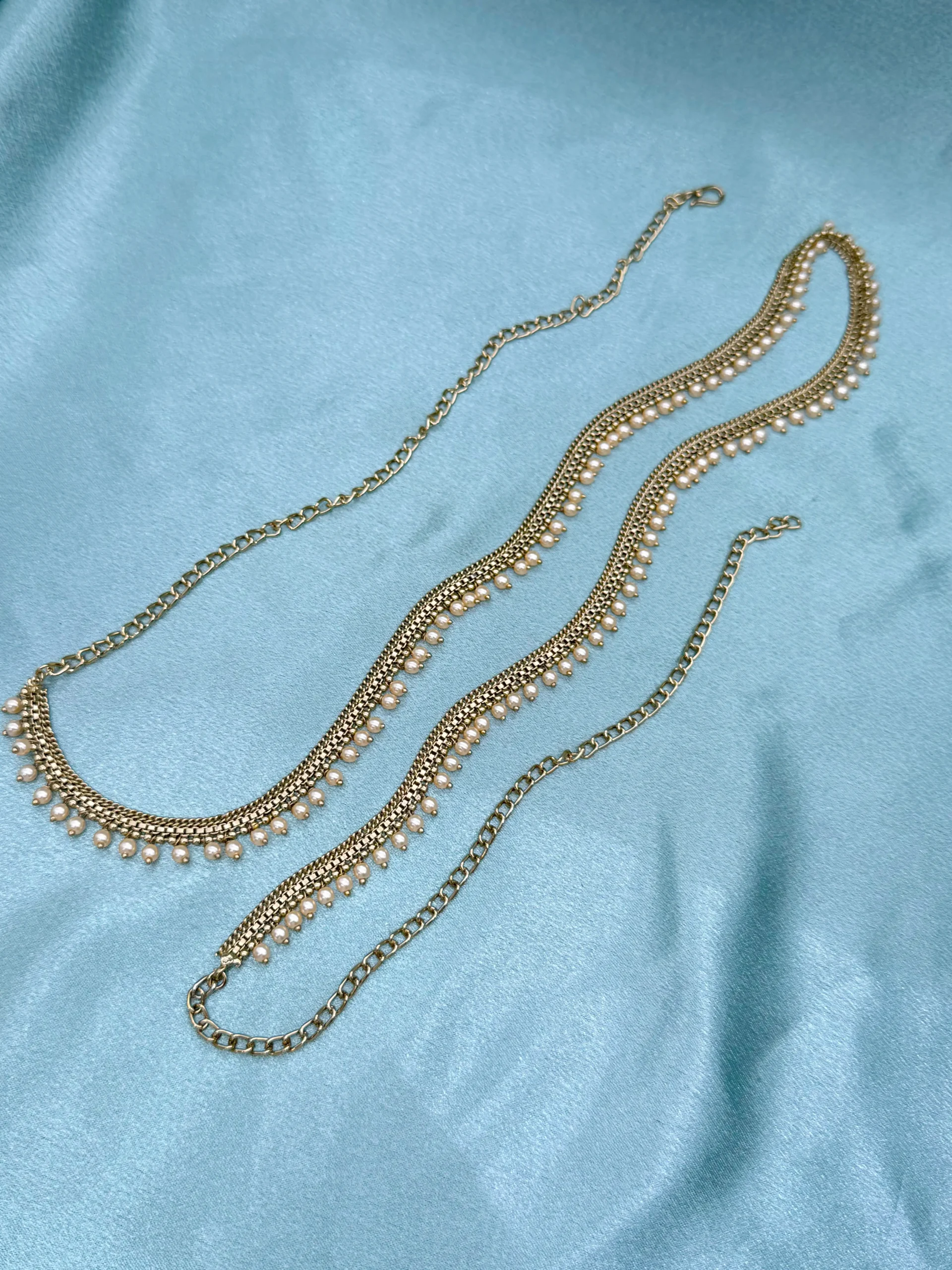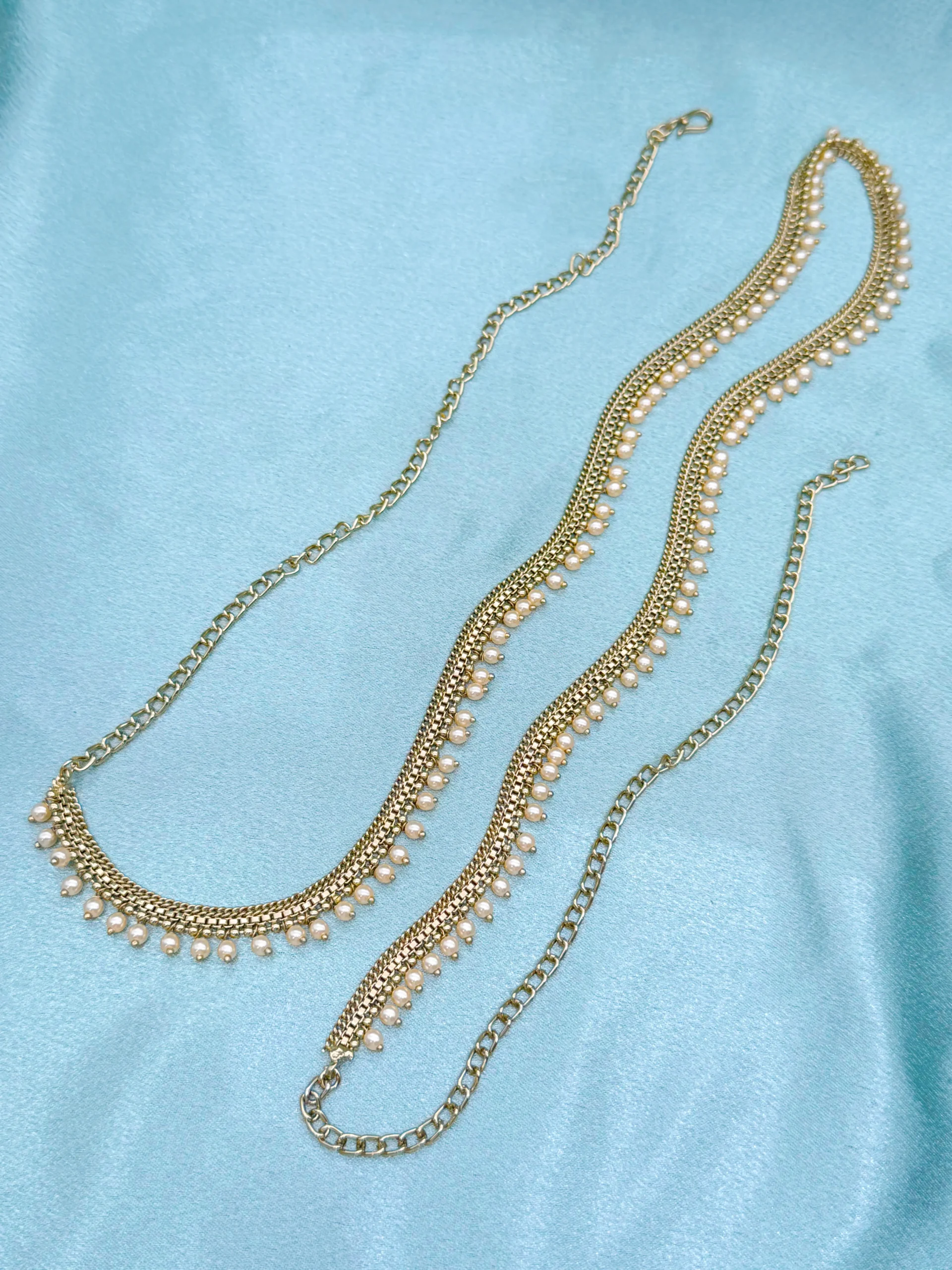 Shop the elegant Pearl Dangler Gold Tone Waist Belt. This delicate, double-layer chain features lustrous Pearl Drops. The perfect lightweight Kamarbandh or Vaddanam for modern bridal and reception wear. The cascading pearls ensure the belt moves beautifully with you, adding a soft, feminine rhythm to the silhouette of your saree or lehenga.