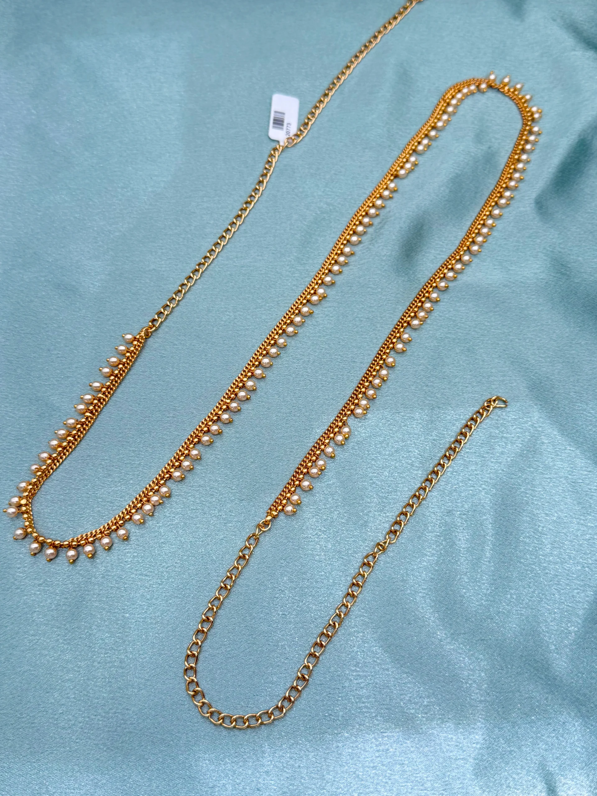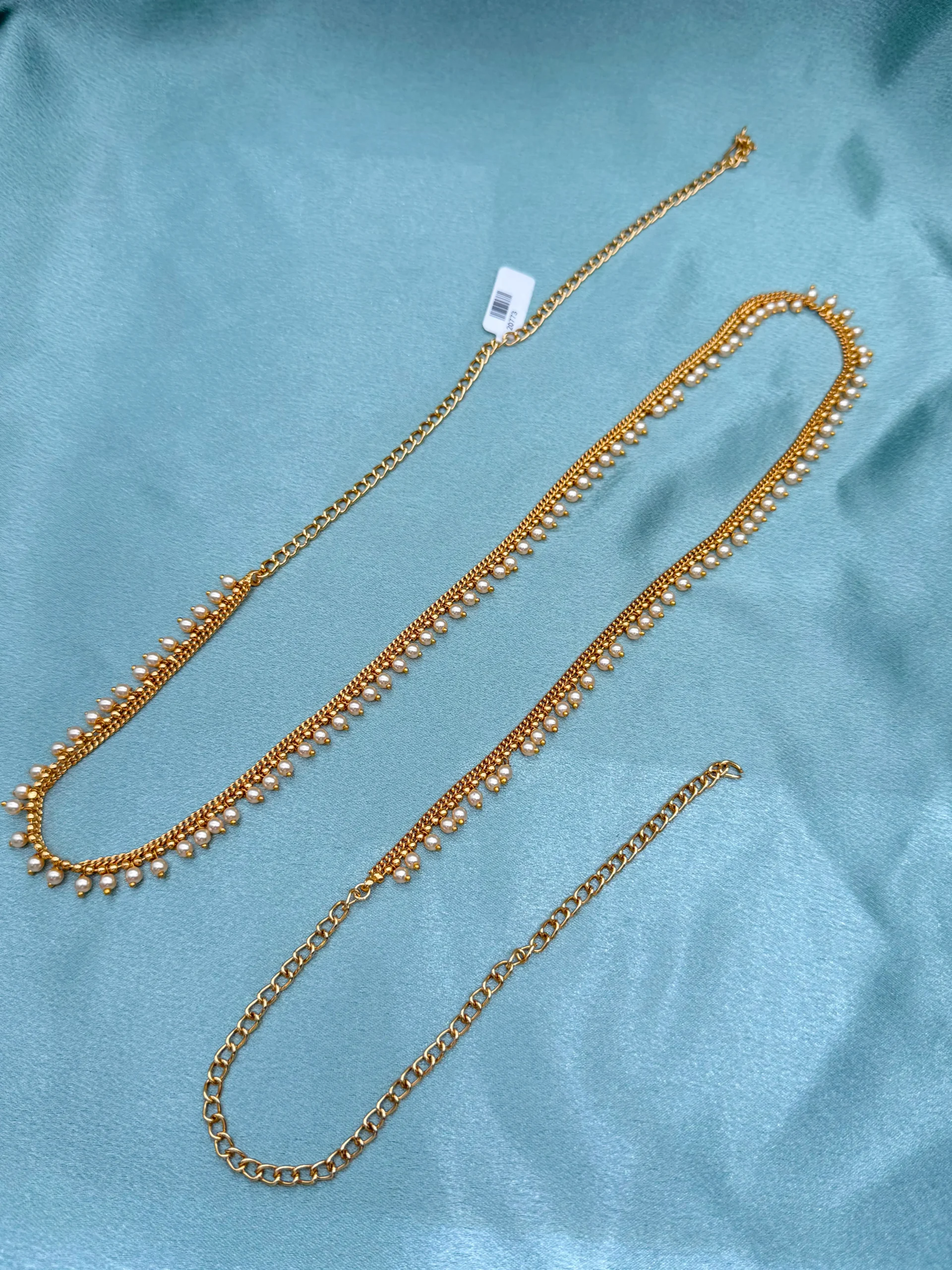 New Look! The Pearl Dangler Gold Tone Waist Belt is a chic, adjustable chain with delicate pearl drops. Perfect as a designer Saree Chain or Kamarbandh to add fluid movement and high-fashion elegance. This creates a mesmerizing, cascading effect around the waist. This delicate combination and the fluid movement of the pearls add a soft, feminine rhythm to the silhouette of your saree or lehenga.
