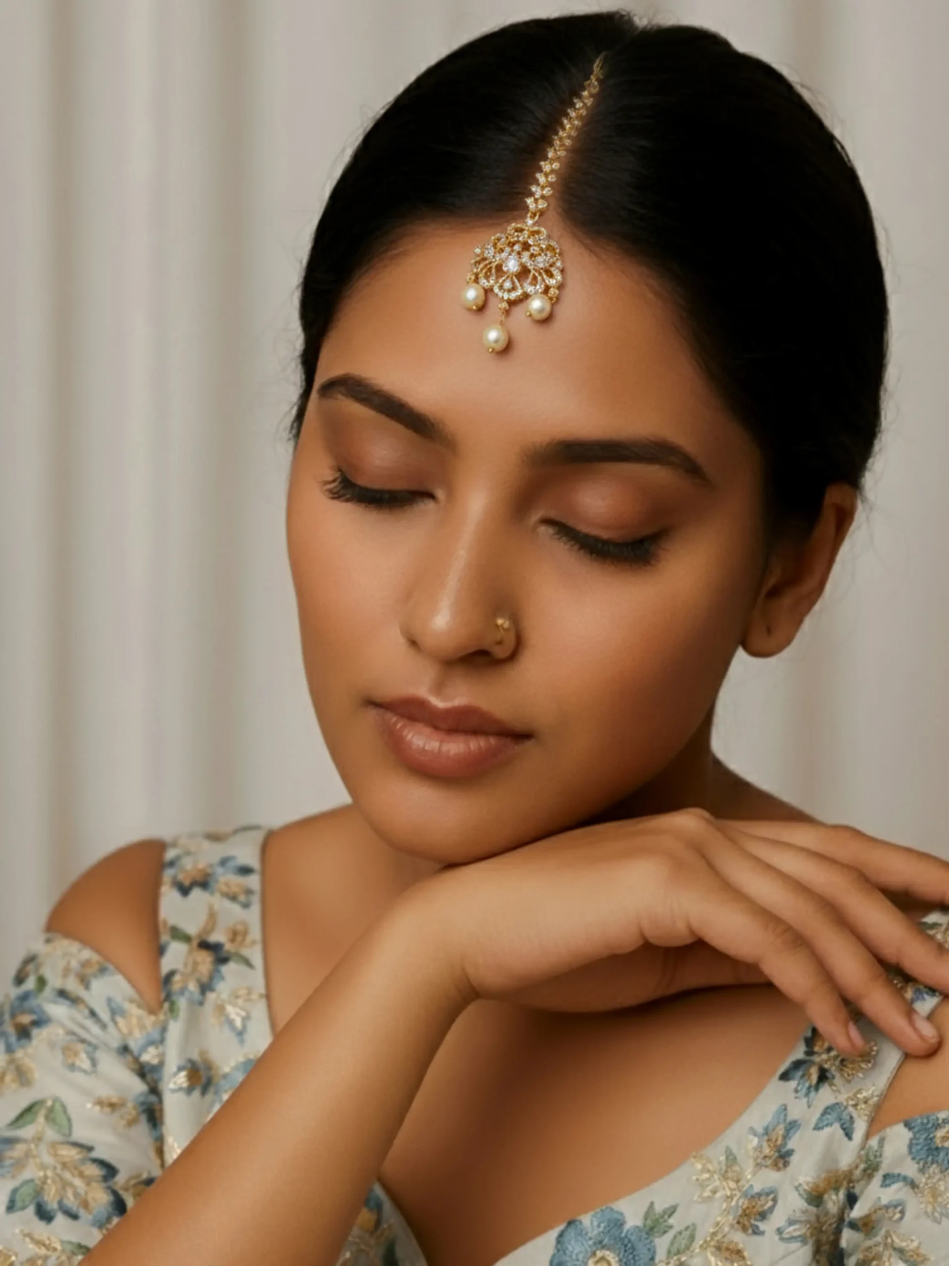 Exquisite Pearl Gold Bridal Tikka featuring a delicate floral pendant set with brilliant white stones. Finished with two lustrous pearl drops and a high-polish gold finish, this piece is perfect for a timeless bridal look. The final, elegant touch is provided by two perfectly round lustrous pearl drops that add grace and subtle movement. Ideal for brides seeking a refined, timeless look,