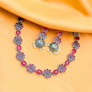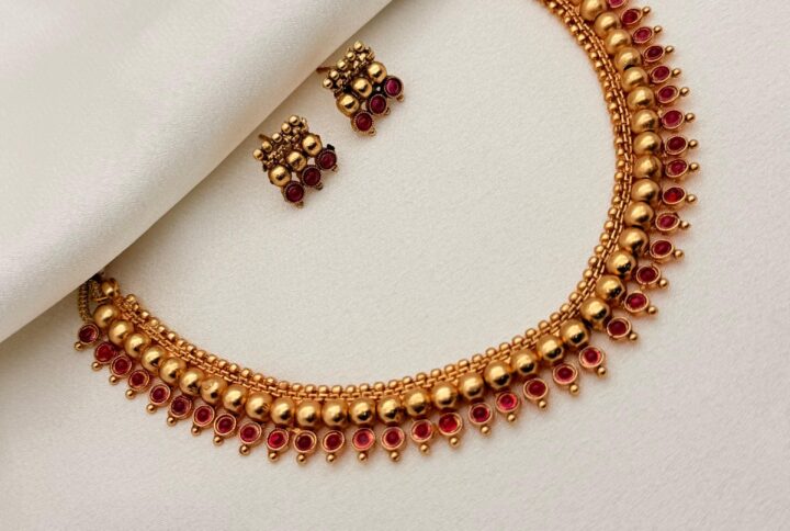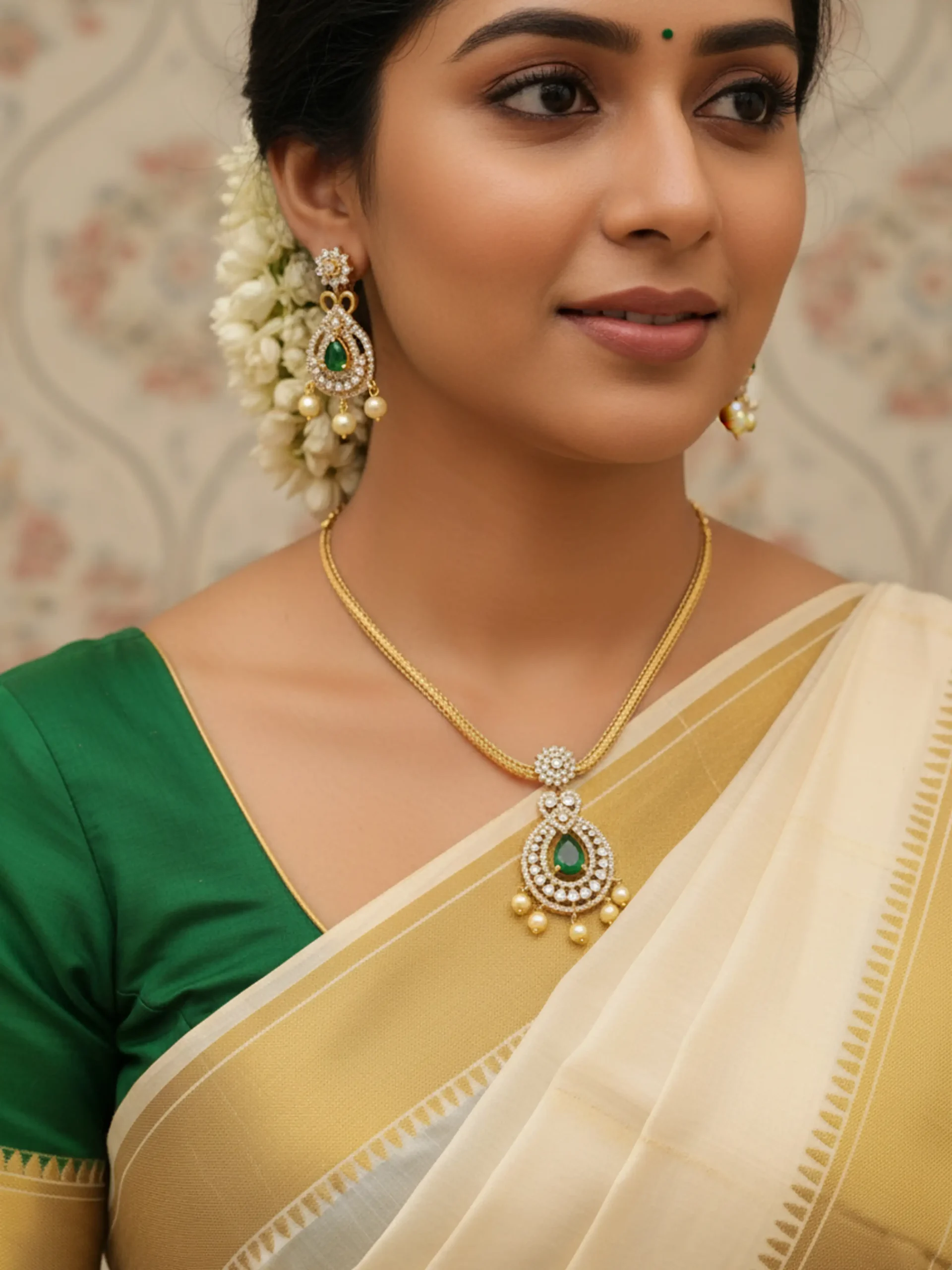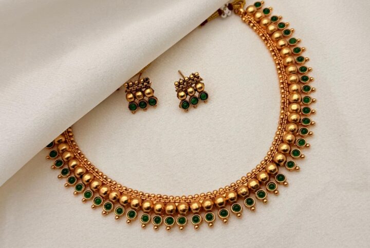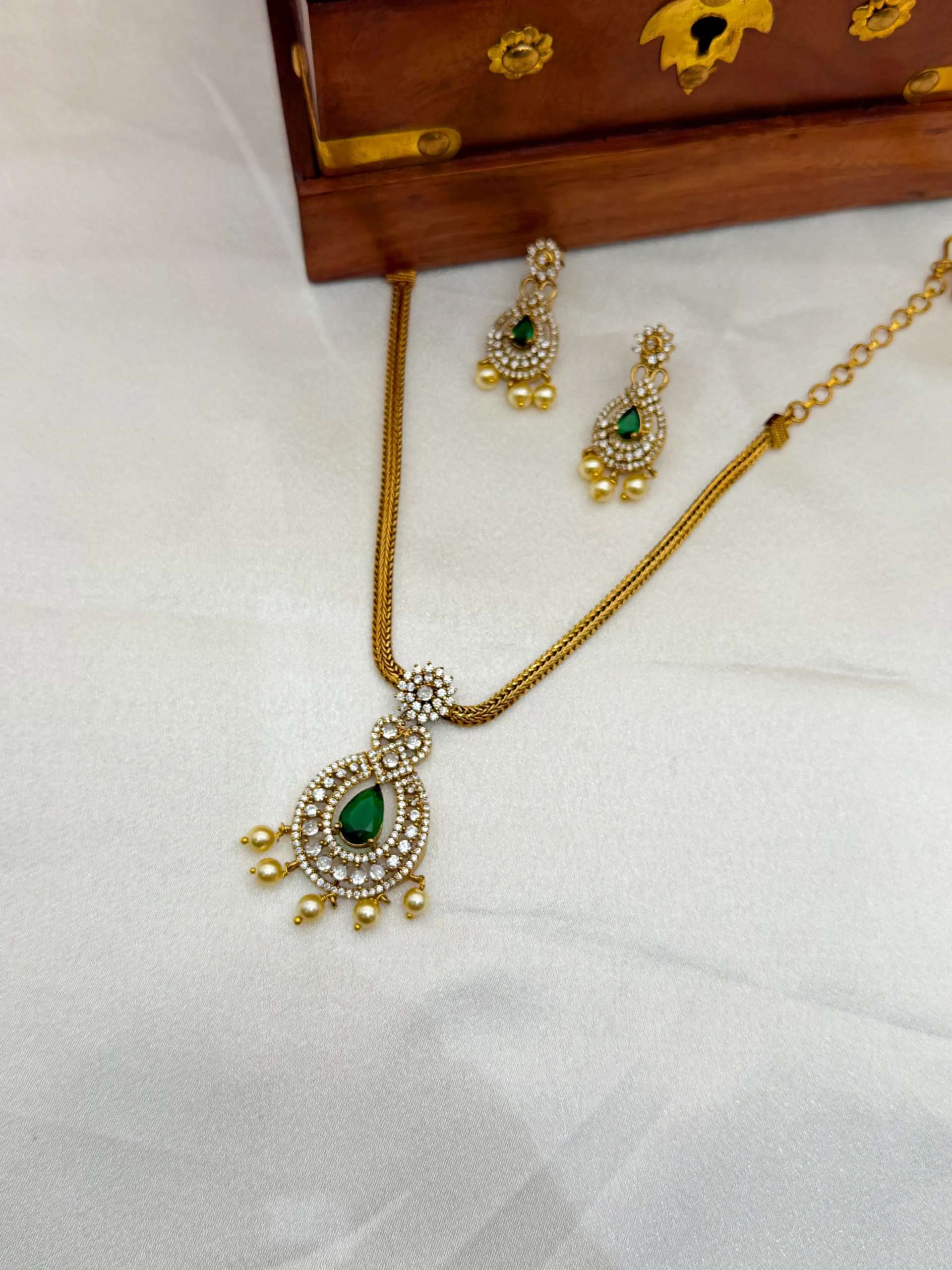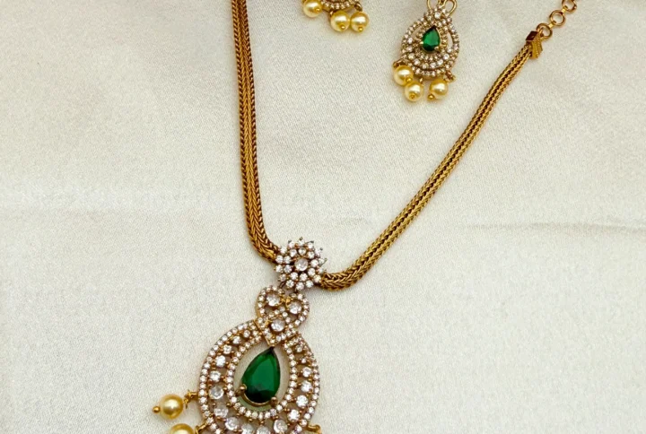 A dazzling Emerald Drop Pendant Set! This antique gold-tone necklace features a teardrop green stone, sparkling white accents, and elegant pearl drops. Perfect for weddings and grand occasions. This set is a perfect blend of traditional design and modern sparkle, making it ideal for brides, wedding guests, or anyone looking to make a sophisticated statement at a festive event.