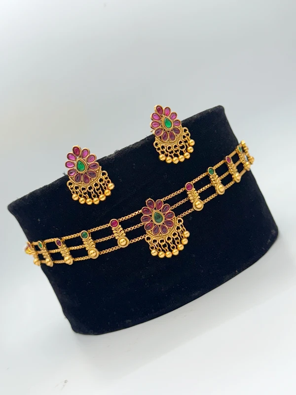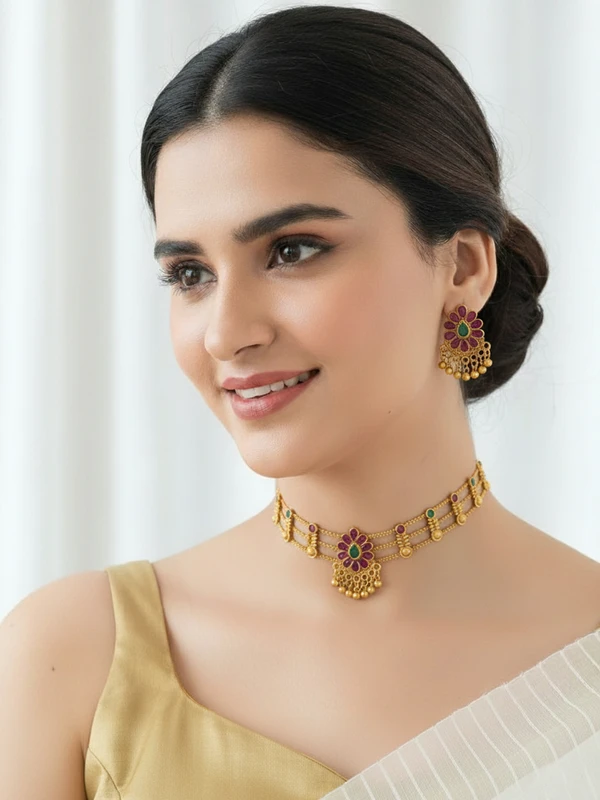 The matching teardrop-style earrings echo the necklace’s opulent floral motif, completing a perfectly coordinated look that screams celebration. Whether it’s a wedding, engagement, or festive occasion, this kemp stone choker set will make you the center of attention.