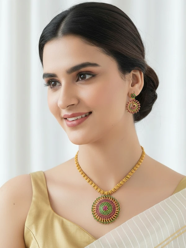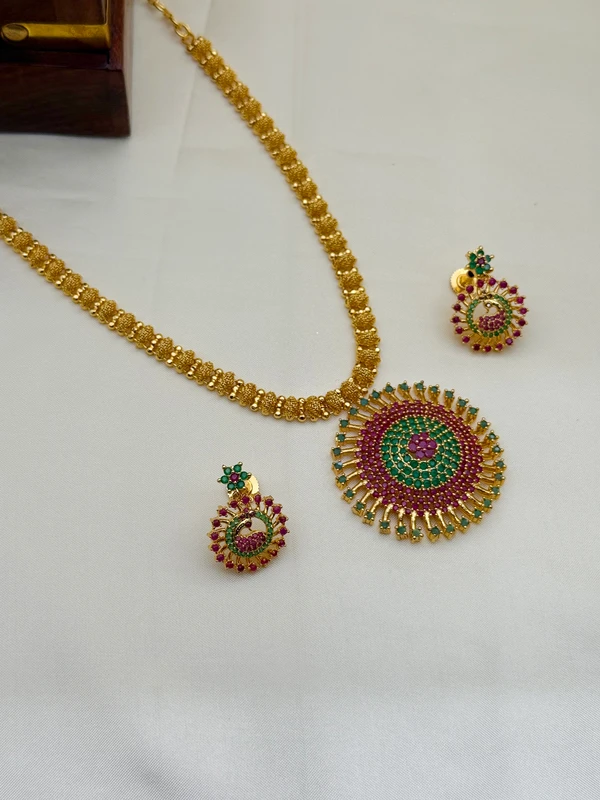 A celebration of timeless temple artistry – this Ruby Emerald Peacock Kemp AD Haram Set is pure heritage luxury. A majestic peacock spreads its glorious tail across a radiant sunburst pendant, with rich ruby body, lush emerald accents and a halo of micro-set American Diamonds that dance with every heartbeat. The classic gold-tone chain carries authentic coin detailing, draping with perfect traditional weightlessness.