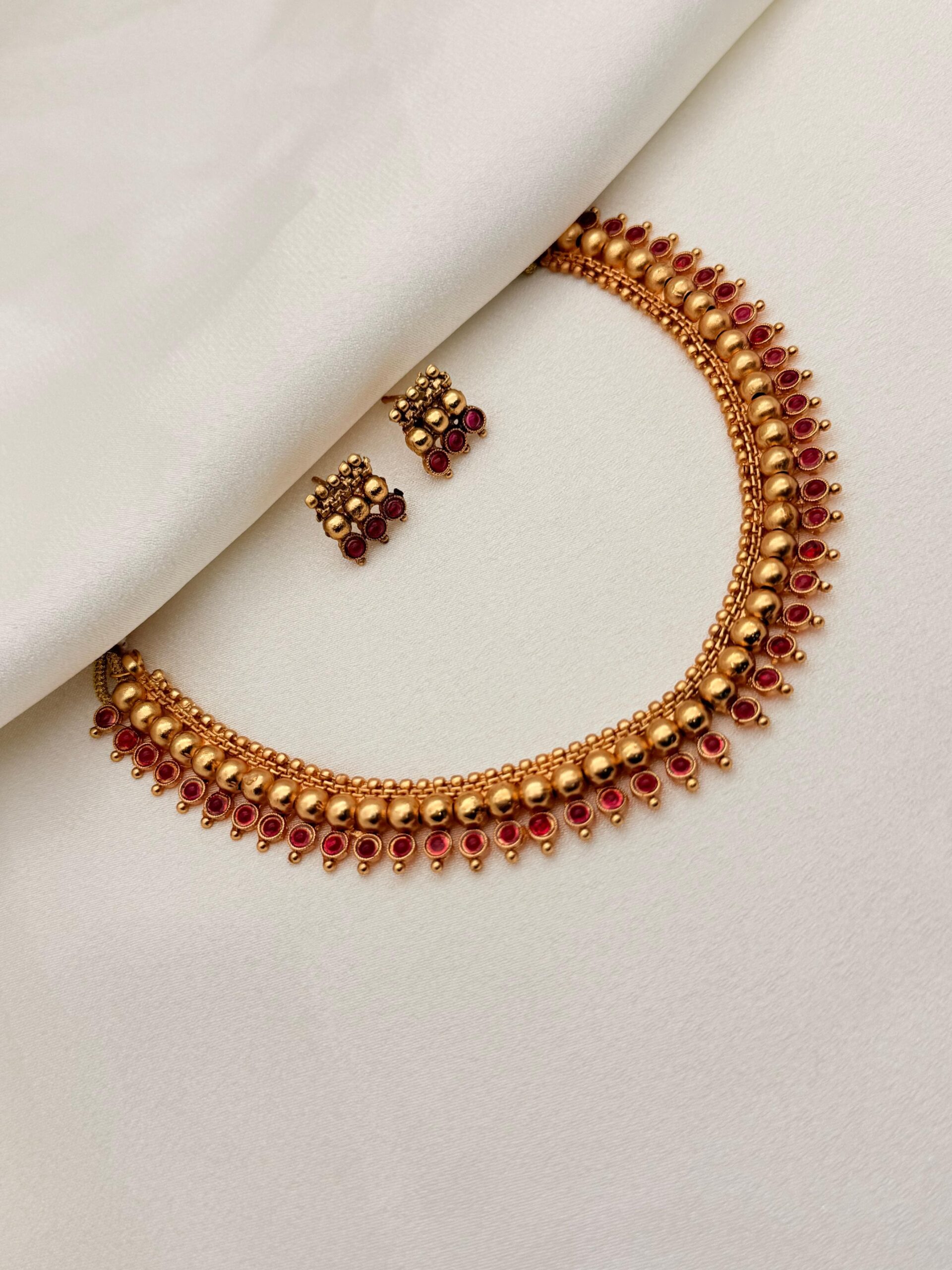 Adorn yourself with timeless elegance the Ruby Glow Antique Necklace Set is a masterpiece of traditional craftsmanship. Designed with lustrous gold-toned beads and radiant ruby-red stones, this necklace perfectly balances regal charm and modern sophistication. Paired with matching earrings, it enhances your festive, bridal, or ethnic ensemble with a touch of royal allure. Perfect for weddings, festivals, and grand celebrations.