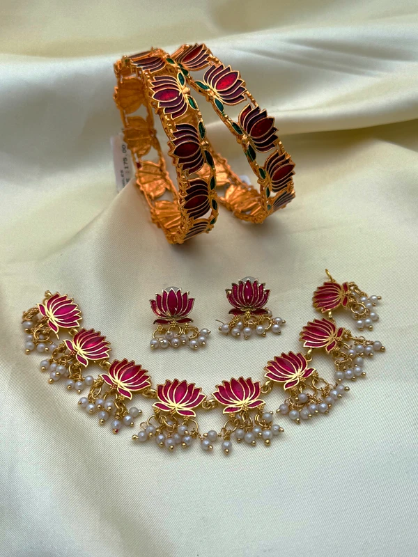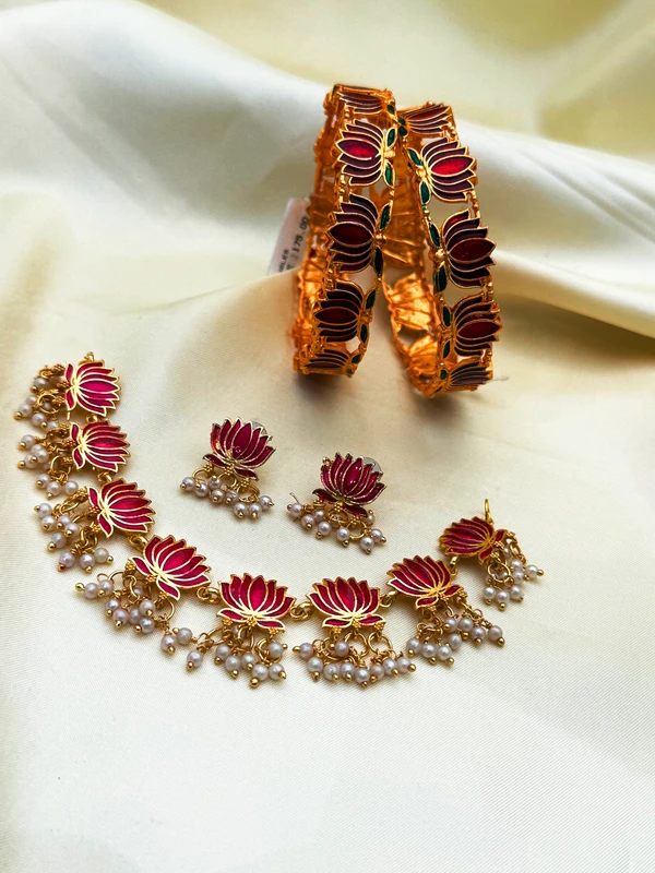 Ignite pure romance with every petal. This exquisite gold-tone combo celebrates eternal love through vibrant ruby red lotus blooms, hand-enamelled with breathtaking meenakari artistry and adorned with cascading pearl drops that dance like morning mist. The matching lotus earrings and intricately carved bangles wrap you in sacred elegance, offering lightweight comfort with unforgettable bridal grandeur.
