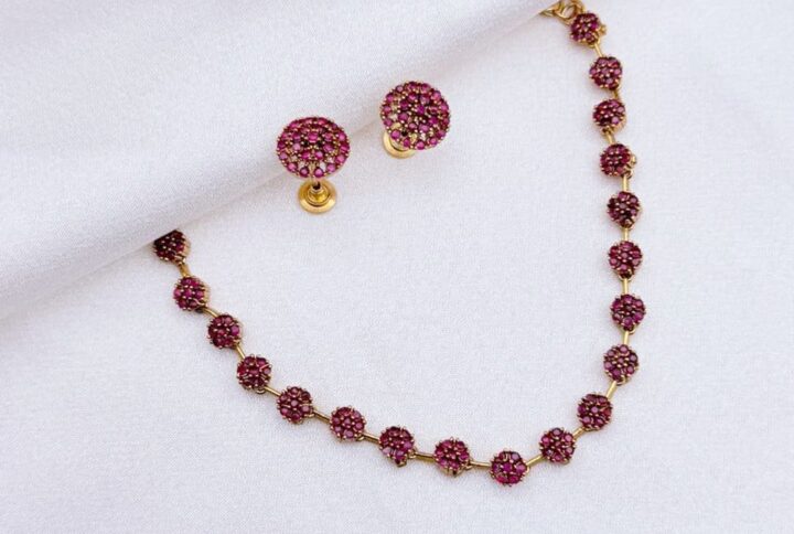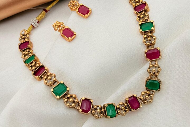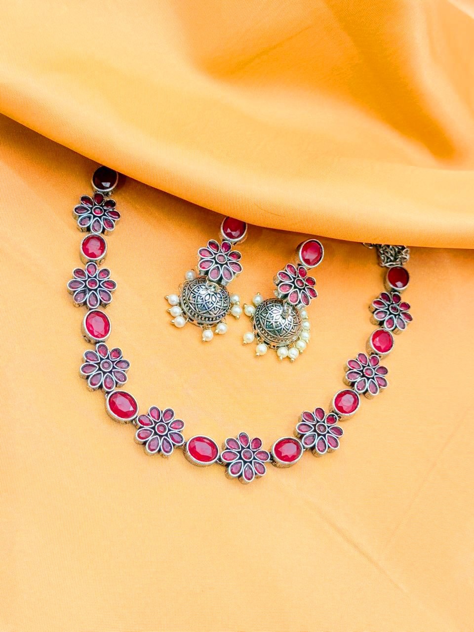 Unveil a look of timeless, captivating beauty with the Ruby Red Stone Oxidized Necklace Set. This stunning antique-style jewelry set masterfully balances the deep, classic tone of oxidized metal with the fiery brilliance of its ruby red gemstones, Designed for the wearer who cherishes bold, heritage-inspired fashion, its dramatic allure guarantees to elevate any ethnic or contemporary ensemble