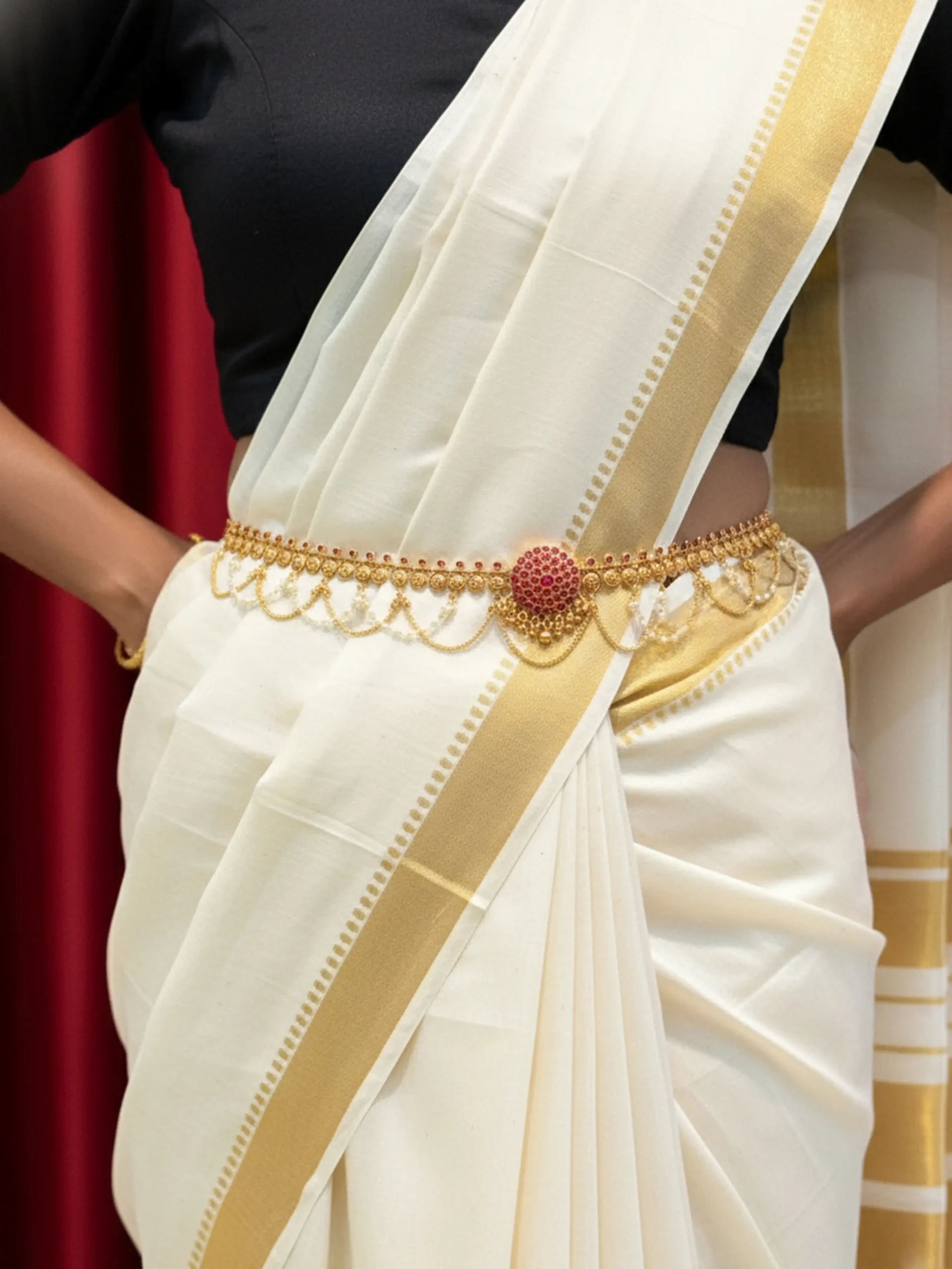 Shop the exquisite Ruby Temple Pearl Drop Hip Chain. This antique gold-plated Vaddanam features rich Kempu Ruby stones set in traditional Temple motifs, finished with elegant pearl drops. The perfect South Indian bridal or festive Kamarbandh accessory.