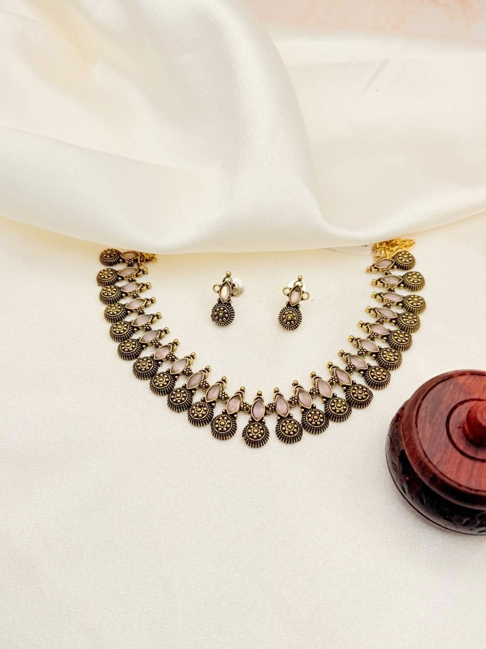 This antique-style jewelry ensemble beautifully combines the grandeur of traditional design with the soft, ethereal glow of its pale central stones. The deep, oxidized bronze-gold finish contrasts magnificently with the light, pearly accents, creating a powerful yet calm statement piece, perfect for occasions demanding quiet, sophisticated style.