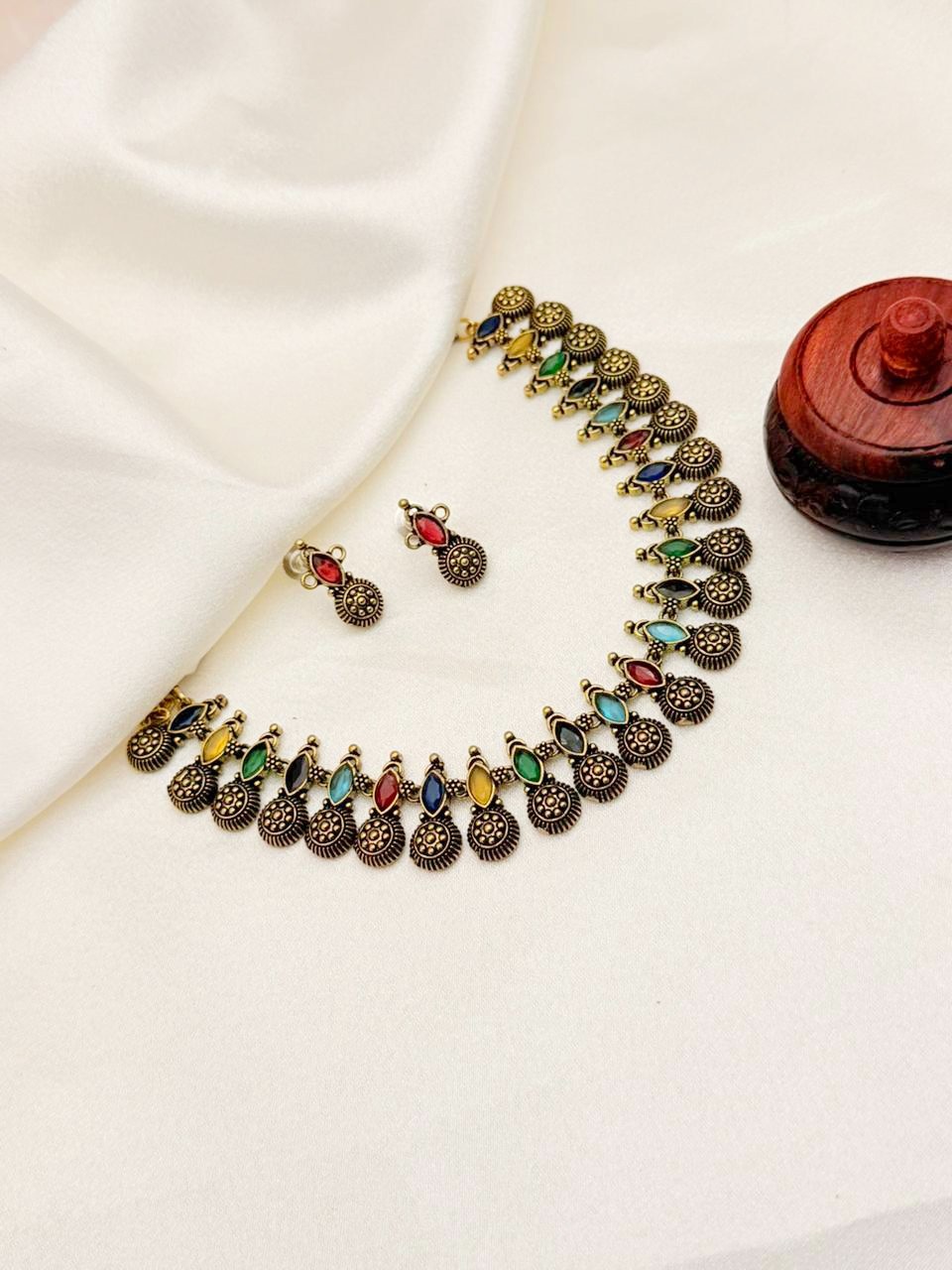 This stunning antique-style necklace and earring ensemble features a rich palette of multi-colored stones, embodying the joy and visual spectacle of Indian celebrations. The vivid hues set against the deep, oxidized gold-toned metal create a magnificent contrast, offering a powerful, cheerfully opulent, and truly unique statement piece for any grand occasion