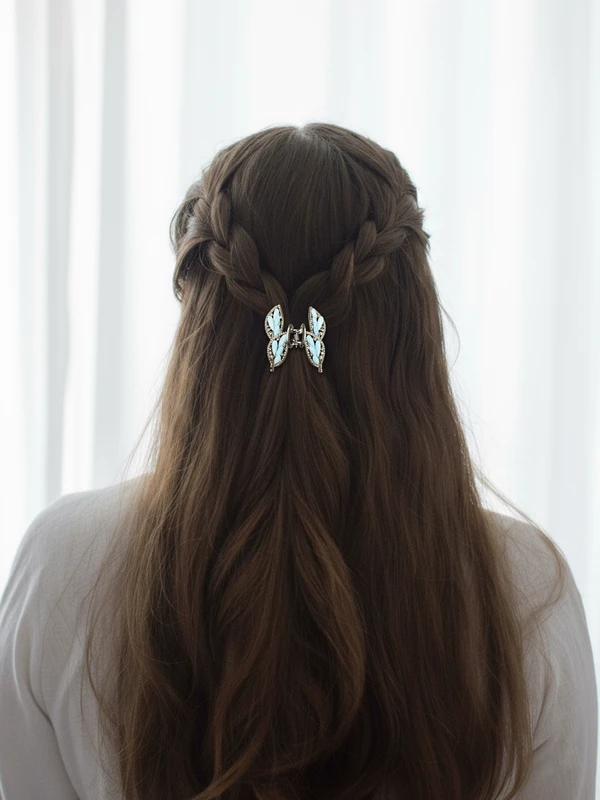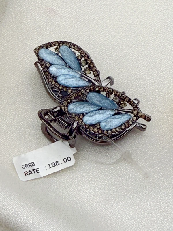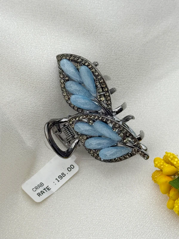 The design features shimmering glitter blue leaf-shaped stones that provide a sophisticated pop of color. Tiny, brilliant crystal stones line the edges, creating an irresistible sparkle that catches the light. Shimmerwing Hair Claw: A luxurious dark silver metal clutcher with glitter blue leaf crystal stones. Provides a strong, eye-catching, and elegant hold for your hair.
