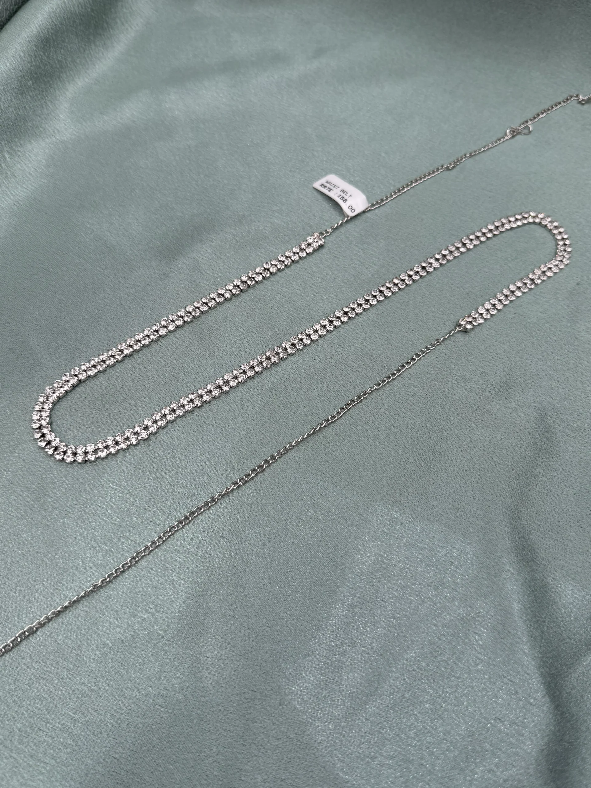 Dazzling Silver Crystal Bridal Waist Belt featuring multiple rows of brilliant crystals in a sleek, high-polish silver finish. This adjustable Kamarbandh is the ultimate modern accessory for adding glamorous definition to any bridal ensemble. The adjustable chain ensures a comfortable and secure fit.