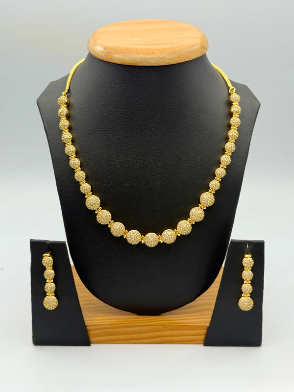 Dazzling gold-tone necklace featuring shimmering American Diamond-encrusted balls linked in perfect harmony, paired with elegant matching drop earrings for pure golden radiance.