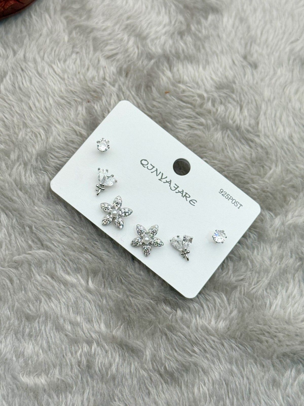 The set includes three distinct pairs of dainty, crystal-studded designs: