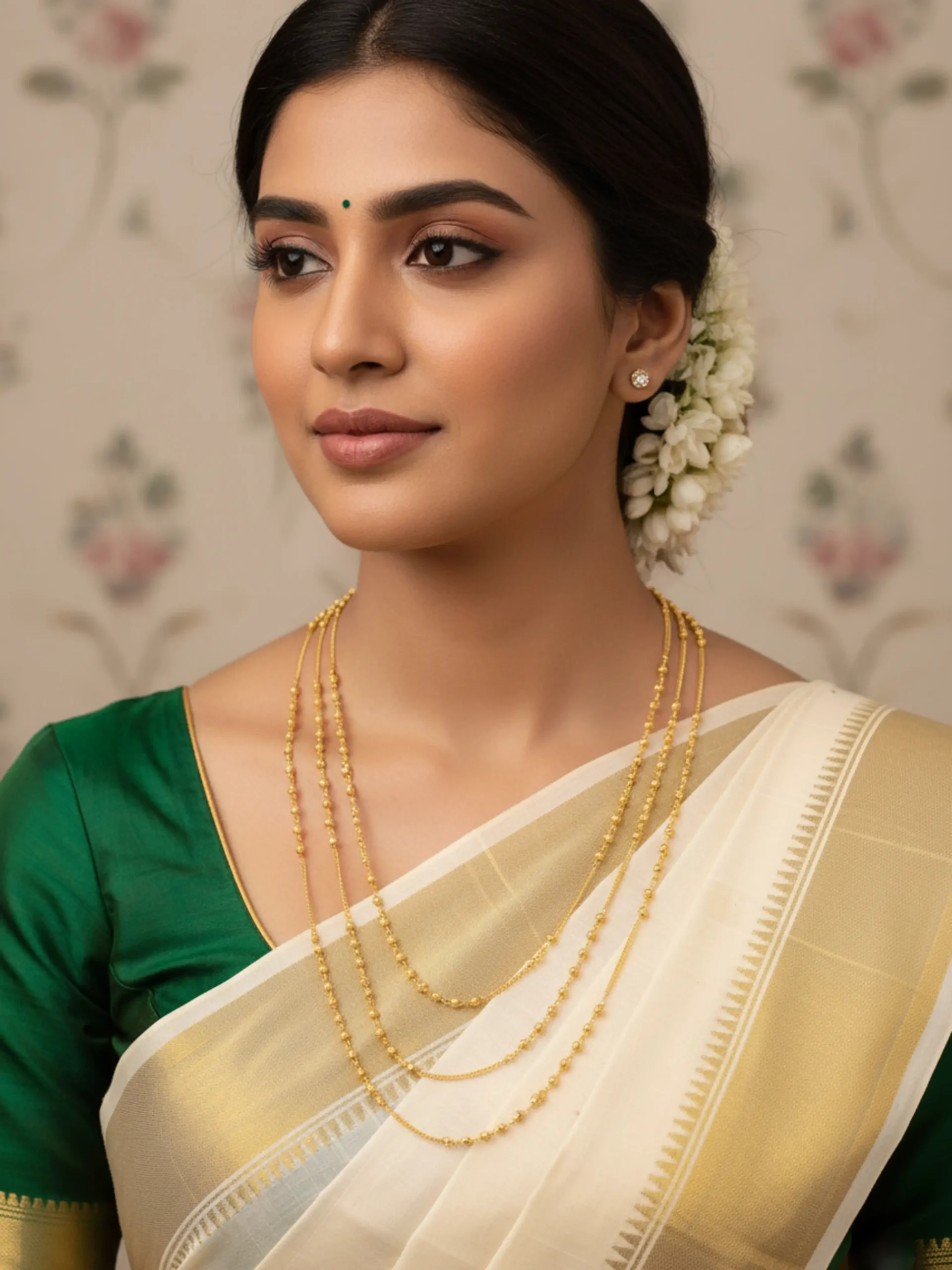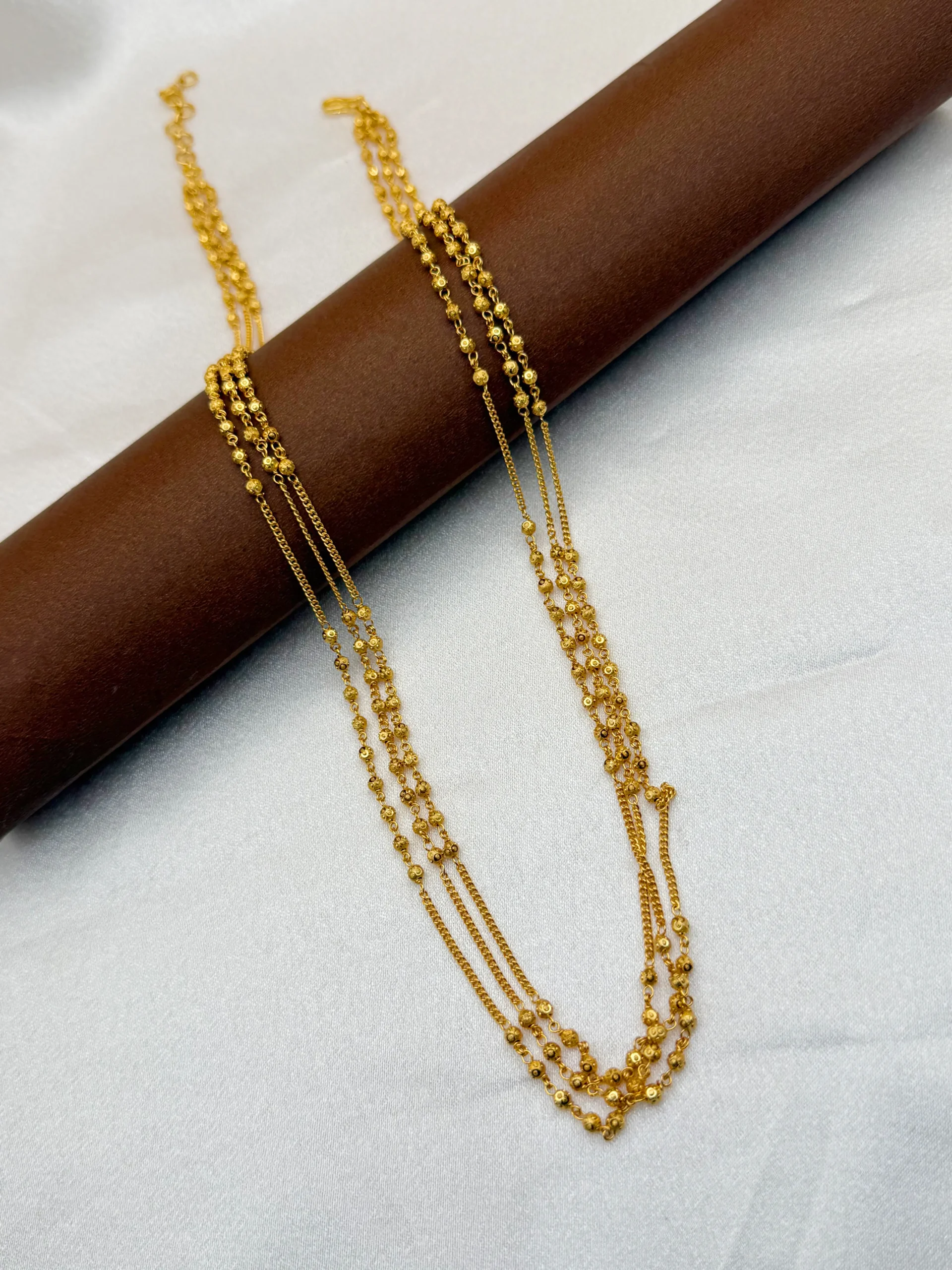 An elegant Three-Layer Gold Tone Haram. This versatile, layered necklace features simple gold beads and fine chains for a modern yet traditional look. Perfect for daily wear or pairing with a pendant. The high-quality gold tone finish ensures lasting shine and is comfortable for all-day wear, easily transitioning from office attire to evening celebrations.
