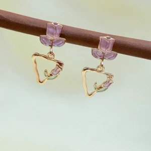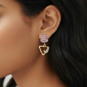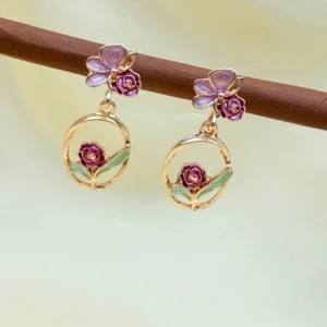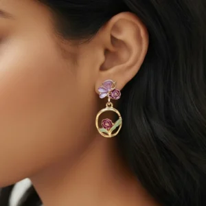 ₹190.00(0)Enchanting gold-tone drop earrings featuring hand-painted purple roses and soft enamel petals that bloom with romantic grace. -