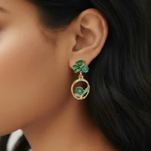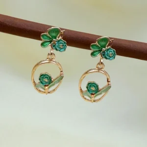 ₹190.00(0)Lush green enamel rose drop earrings in radiant gold-tone, featuring a blooming rose nestled in a delicate open circle for fresh, feminine charm. -