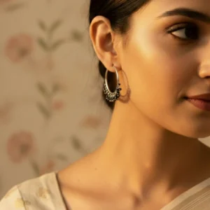 ₹175.00(0)Romantic gold-tone hoop earrings adorned with soft pink bead clusters. Feminine elegance that whispers luxury with every gentle sway. -