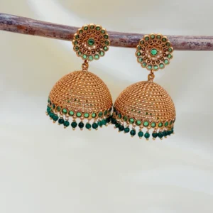 ₹990.00(0)Regal matte gold jhumka earrings adorned with rich emerald green stones and delicate dangling beads for timeless ethnic charm. -