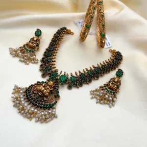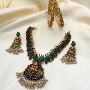 ₹1,186.00(0)Divine antique gold-tone emerald green Laxmi necklace set with pearl drops, matching earrings & bangles – pure temple grandeur. -