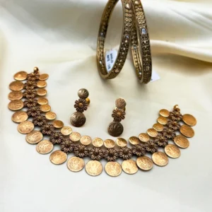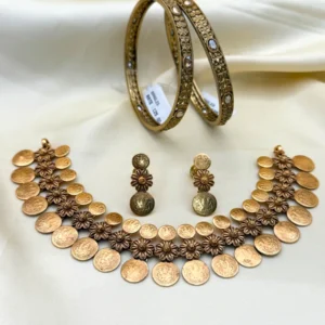 ₹1,045.00(0)Timeless antique gold-tone Laxmi coin necklace with matching tops & crystal-stone bangles – pure bridal heritage elegance. -