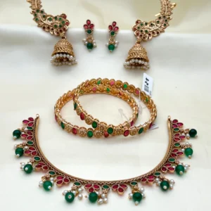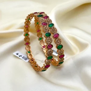 ₹1,173.00(0)Gorgeous ruby red & emerald green kemp stones with dangling pearls in antique gold necklace, paired with size 2.8 bangles, peacock jhumkas & studs –… -