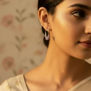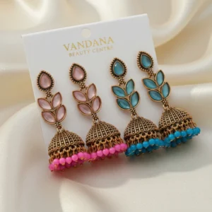 ₹168.00(0)Pastel magenta & blue jhumka earrings combo – antique gold-tone with sparkling AD stones, perfect soft glamour for weddings & festive looks.