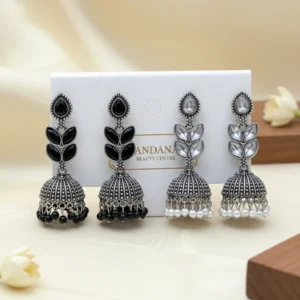 ₹168.00(0)Timeless silver-tone oxidised jhumka combo in dramatic black & pristine white – instant ethnic drama for every look. -
