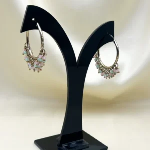 ₹168.00(0)Chic gold-tone hoop earrings dripping with soft pastel mint & pink beads. Effortless boho-glam sparkle for everyday radiance. -