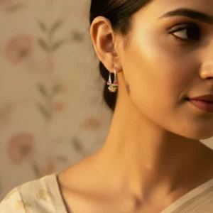 ₹168.00(0)Stunning gold-tone bali hoops dripping with vibrant emerald-green bead clusters – perfect ethnic sparkle with playful movement. -