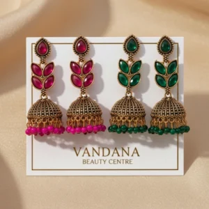 ₹168.00(0)Radiant magenta & emerald gold-tone jhumka combo with AD sparkle – double the royal glamour for every festive look. -