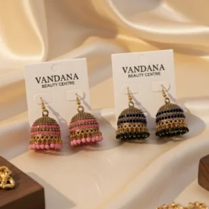₹138.00(0)Delicate gold-tone jhumka combo in romantic pink & dramatic black – timeless charm with every enchanting sway.