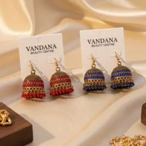 ₹138.00(0)Royal gold-tone jhumka combo in passionate ruby red & majestic sapphire blue – timeless elegance with every sway. -