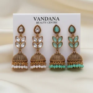 White & mint green jhumka earrings combo – antique gold-tone with AD & kundan sparkle, perfect bridal & festive elegance.