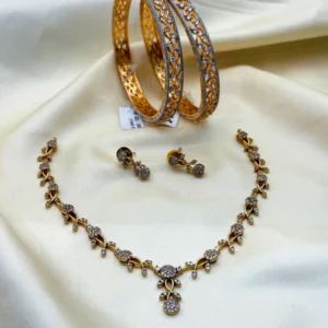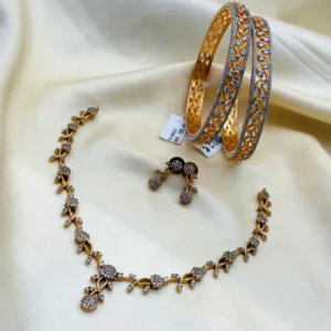 Exquisite gold-tone white CZ rose necklace with matching floral drops & sparkling bangles – delicate luxury that steals every heart.